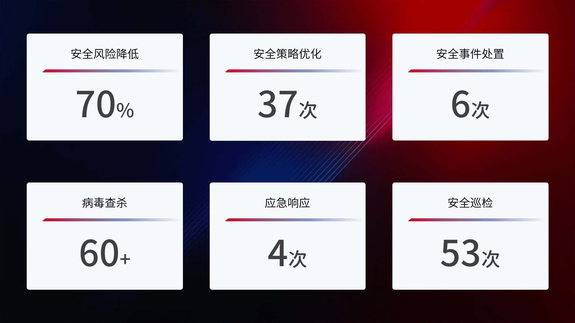 提供全面的安全事件报告体系,,,,包括处置报告、、、、周报、、、季度和年度总结,,,结合持续监控,,,,帮助客户深入了解网络安全状况。。