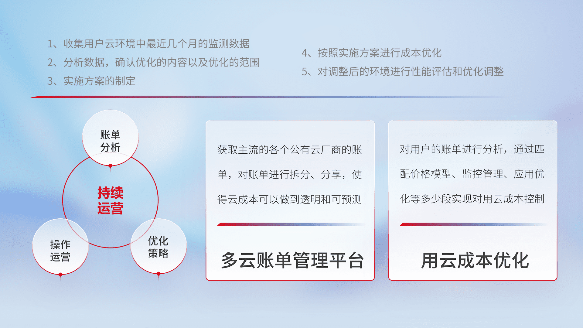 通过多云纳管,,,,以统一的资源数据模型把客户的云资源进行抽象和封装,,进而实现对多云资源的统一操作,,保障云资源管理的可靠性、、、稳定性与可用性。。。量身定制化运维内容,,配置、、、、开发运维、、、、补丁管理、、、备份、、监控、、、认证和访问管理、、、审计和日常巡检等,,,,保障在用云过程中的可靠度,,稳定度以及高可用率。。